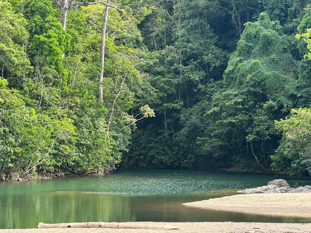 We continued on until reaching the Rio Claro. A beautiful, cool lagoon lay just beyond the beach where the river slowly discharged its flow. We forded at the shallowest part and discreetly left our packs on the shore. Then it was a matter a swimming about a 100m upstream to where a small cascade joined the main river. Janie climbed up and reported the way on was quite difficult. As we only brought a pair of thongs with us, I decided not to continue in that direction, instead swimming further upstream. I managed to reach a section of river partially blocked by a large boulder and some white water I wasn’t able to pass through about 400m upstream. Turning around, I floated with the current back to the packs to await Janie.