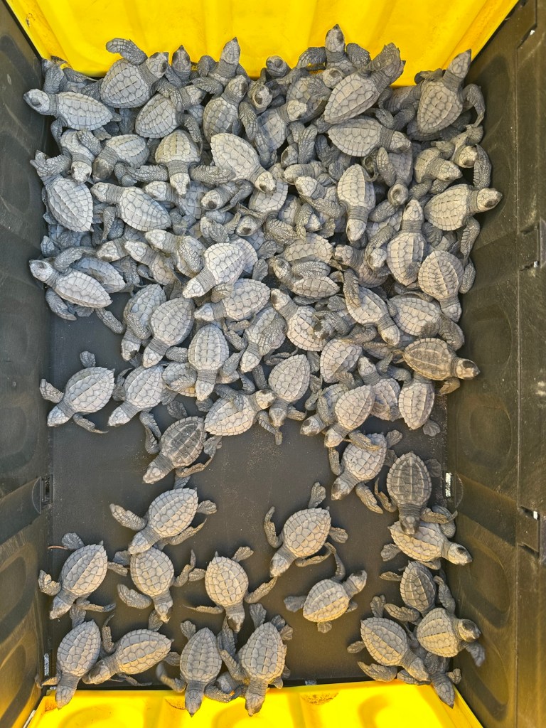 I helped with transferring the hatchlings into special containers used for their release. Then the containers were carried down to the beach and placed inside a roped off area prior to the relapse. Finally, a section of the container was removed so the hatchlings had free access to the beach. Then, following natural instinct born over millennia, the hatchlings made their way down to the water; the waves collecting them in its embrace and taking them out to sea.
