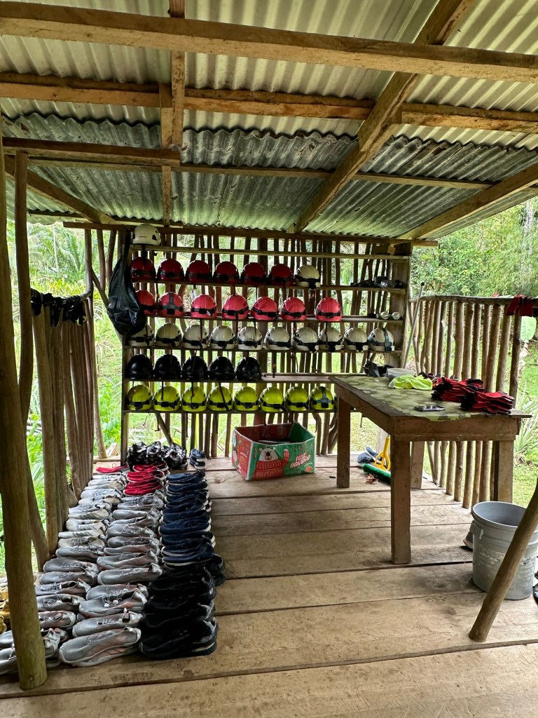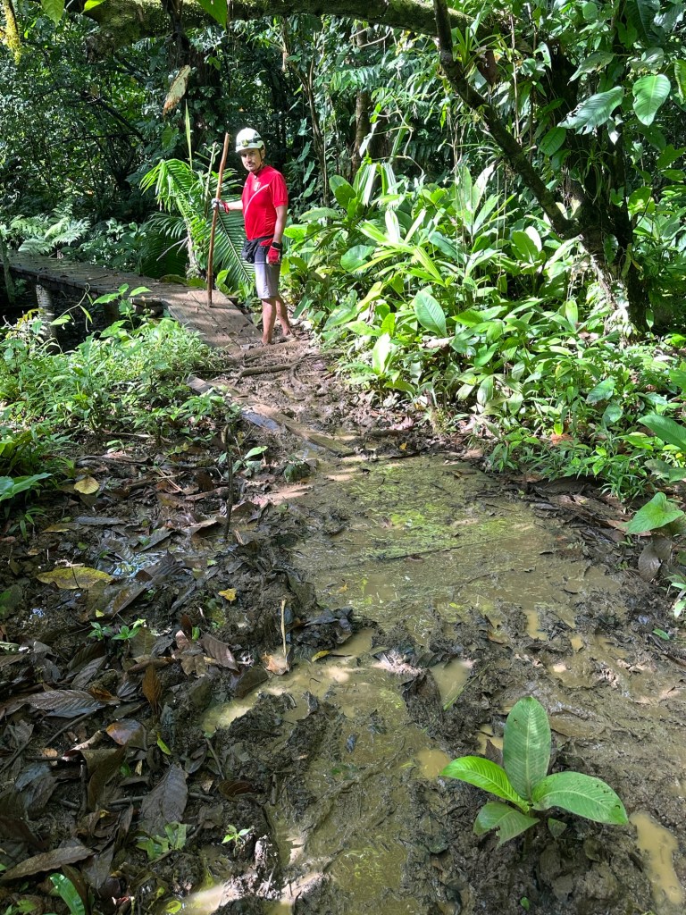 We were provided with a helmet and light and a pair of reef shoes. I was quite surprised at the quality of the equipment – I was expecting much less. Of course, the rain which had been my constant companion since arriving in the archipelago, had been steadily doing its thing, rendering the trail to the cave a treacherous, muddy mess. Planks and boards were placed in some sections, but in others it was just a case of one foot in front of the other and hoping not to come a cropper. The mud was ankle deep in places and I was glad of the reef shoes.